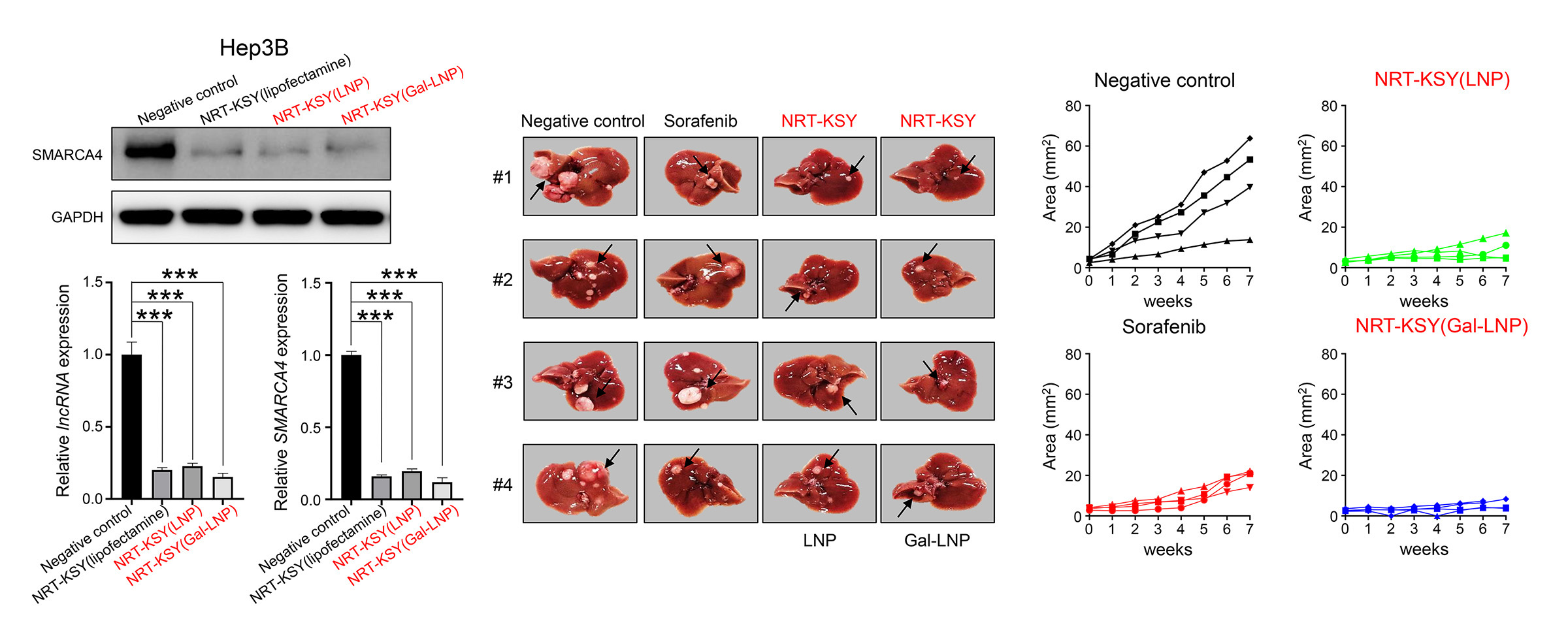 NRT-KSY는 간암형성에서 주요한 역할을 하는 SMARCA4와 SMARCA4에 결합하는 miRNA를 흡수하는 lncRNA의 발현을 2가지의 siRNA 물질로 동시에 차단하는 기전을 가진 파이프라인입니다. 간암세포에서 종양 유발 유전자인 SMARCA4의 발현을 두가지 방식으로 완전히 억제함으로써 암세포의 형성 및 성장을 효과적으로 억제하게 됩니다.
