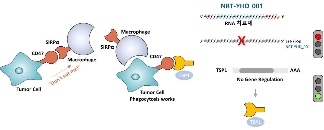 1) NRT-YHD_001은 let-75p miRNA의 안티센스로서, 2) TSP1의 변역을 복원하여 3) 247과 SIRPα의 상호작용을 억제함. 이는 4) "Eat Me" 신호를 활성화여 대식세포에 의해 암세포를 제거하게 됨.
